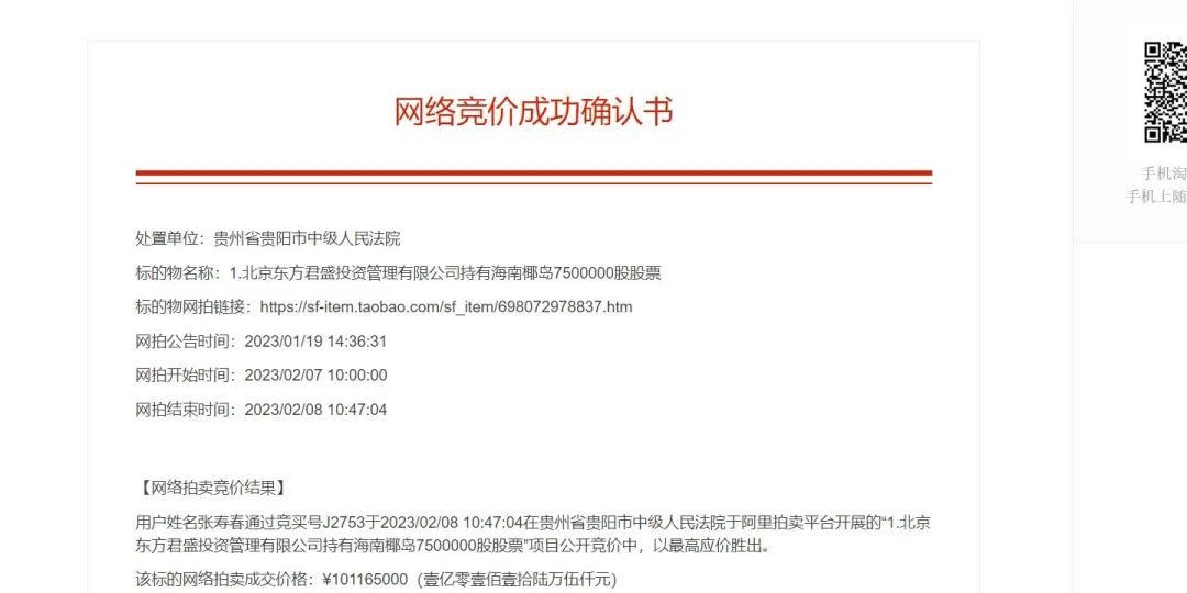 在首次拍賣無人問津后,海南椰島(600238)大股東東方君盛所持部分股票在二拍中已被一位叫張壽春的自然人拿下。根據(jù)阿里司法拍賣平臺(tái)顯示,貴陽市中級(jí)人民法院于2月7日10時(shí)至2月8日10時(shí)在“阿里司法拍賣網(wǎng)”上公開拍賣東方君盛持有的海南椰島7
