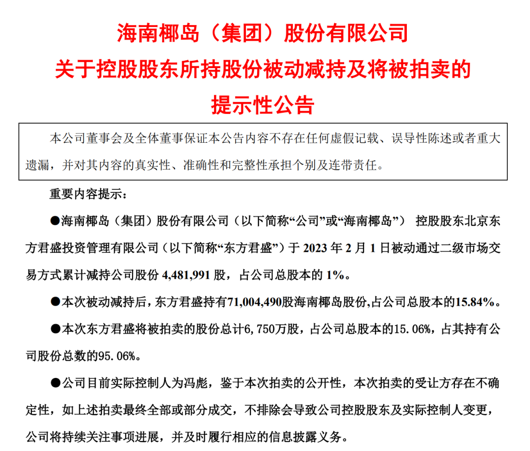而本次拿下海南椰島部分股份也是張壽春最新一次的出手?;厮輥砜?,2月3日晚間,海南椰島拋出了一紙關(guān)于控股股東所持股份被動(dòng)減持及將被拍賣的公告。