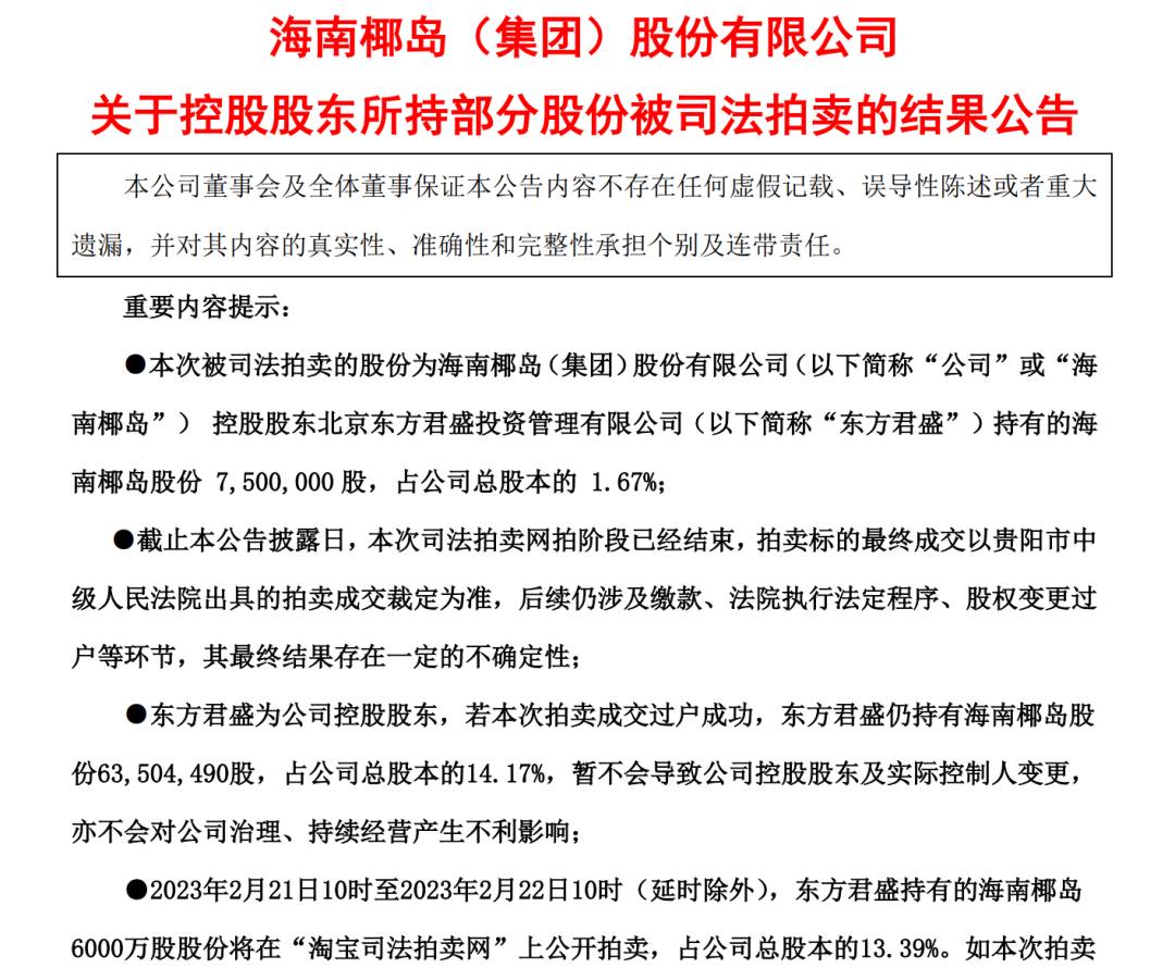 根據(jù)阿里司法拍賣平臺(tái)顯示,貴陽市中級(jí)人民法院于2月7日10時(shí)至2月8日10時(shí)在“阿里司法拍賣網(wǎng)”上公開拍賣東方君盛持有的海南椰島750萬股股票。