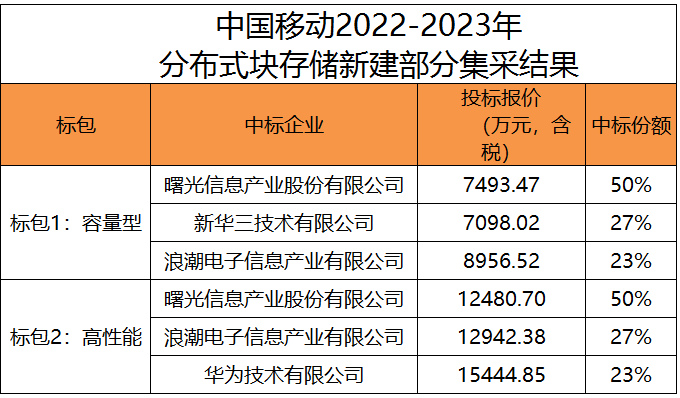 從中國(guó)移動(dòng)(600941)官網(wǎng)獲悉,中國(guó)移動(dòng)日前公示了2022年至2023年分布式塊存儲(chǔ)新建部分的集采結(jié)果,中科曙光(603019)、新華三、浪潮信息(000977)和華為四家中標(biāo)。