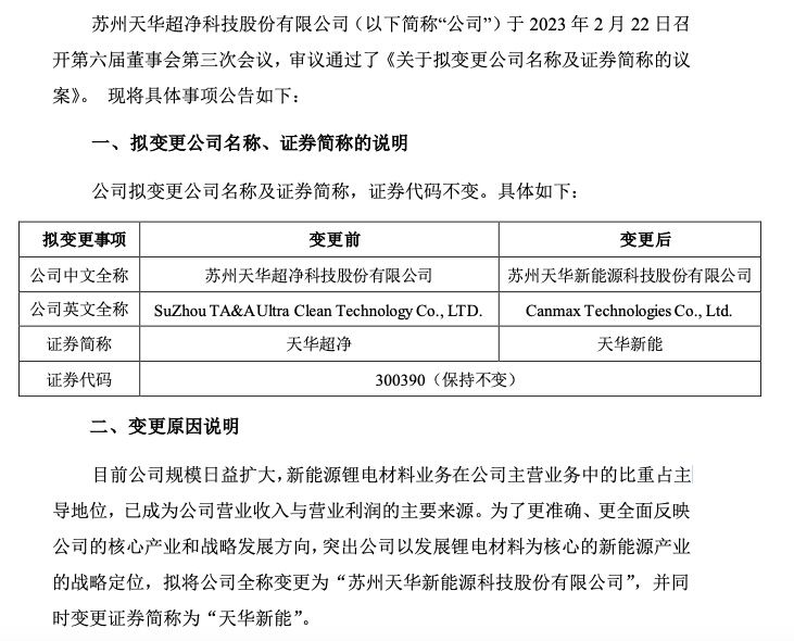 蘇州天華超凈(300390)科技股份有限公司(以下簡(jiǎn)稱“天華超凈”或“公司”)2月22日晚間發(fā)布關(guān)于擬變更公司名稱及證券簡(jiǎn)稱的公告。公告稱,鑒于目前新能源鋰電材料業(yè)務(wù)在主營(yíng)業(yè)務(wù)中的比重占主導(dǎo)地位,已成為公司營(yíng)業(yè)收入與營(yíng)業(yè)利潤(rùn)的主要來(lái)源,擬將公司名稱變更為“蘇州天華新能源科技股份有限公司”,證券簡(jiǎn)稱擬同步變更為“天華新能”。