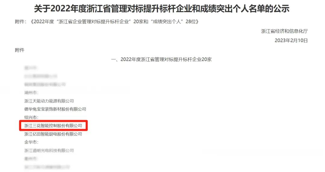 2月13日,浙江省經(jīng)信廳公布了2022年度浙江省管理對(duì)標(biāo)提升標(biāo)桿企業(yè)名單,認(rèn)定20家企業(yè)為“浙江省管理對(duì)標(biāo)提升標(biāo)桿企業(yè)”,三花智控(002050)榮登榜單。