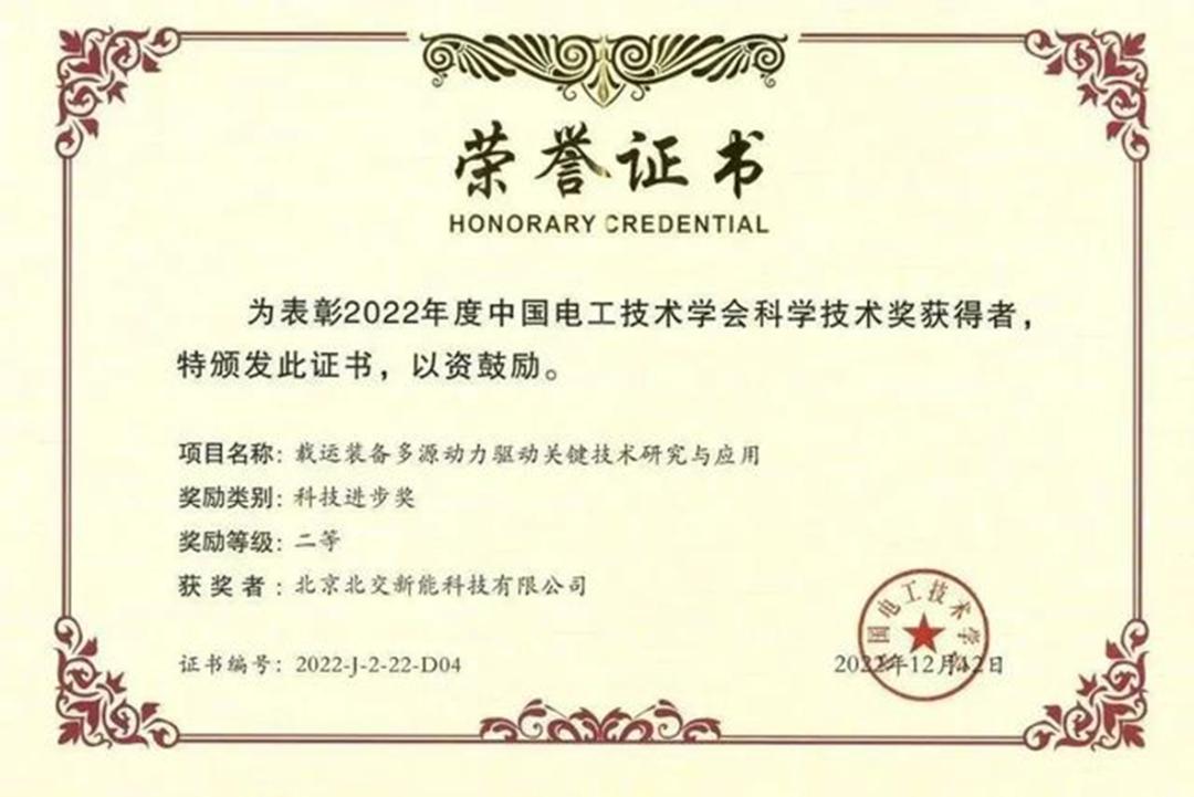 2022年底,中國電工技術(shù)學(xué)會(huì)“2022年科技進(jìn)步獎(jiǎng)評(píng)選”公布,北交新能“運(yùn)載裝備多源動(dòng)力驅(qū)動(dòng)關(guān)鍵技術(shù)研究與應(yīng)用”項(xiàng)目榮獲中國電工技術(shù)學(xué)會(huì)科技進(jìn)步二等獎(jiǎng)。