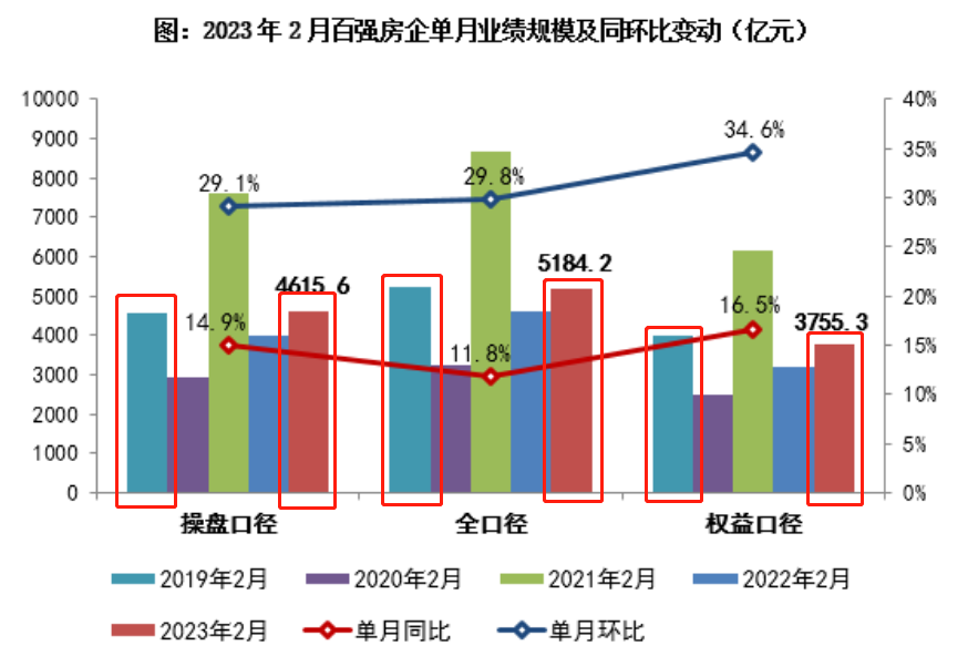 隨著近日各房企陸續(xù)公布今年前兩個(gè)月的銷售業(yè)績(jī),房地產(chǎn)行業(yè)復(fù)蘇預(yù)期似乎已基本確立。克而瑞行業(yè)數(shù)據(jù)顯示,今年2月,TOP100房企實(shí)現(xiàn)銷售操盤金額4615.6億元,單月業(yè)績(jī)環(huán)比增長(zhǎng)29.1%、同比增長(zhǎng)14.9%,無(wú)論是操盤口徑、全口徑還是權(quán)益口徑,均已基本恢復(fù)至疫情前2019年的水平。
