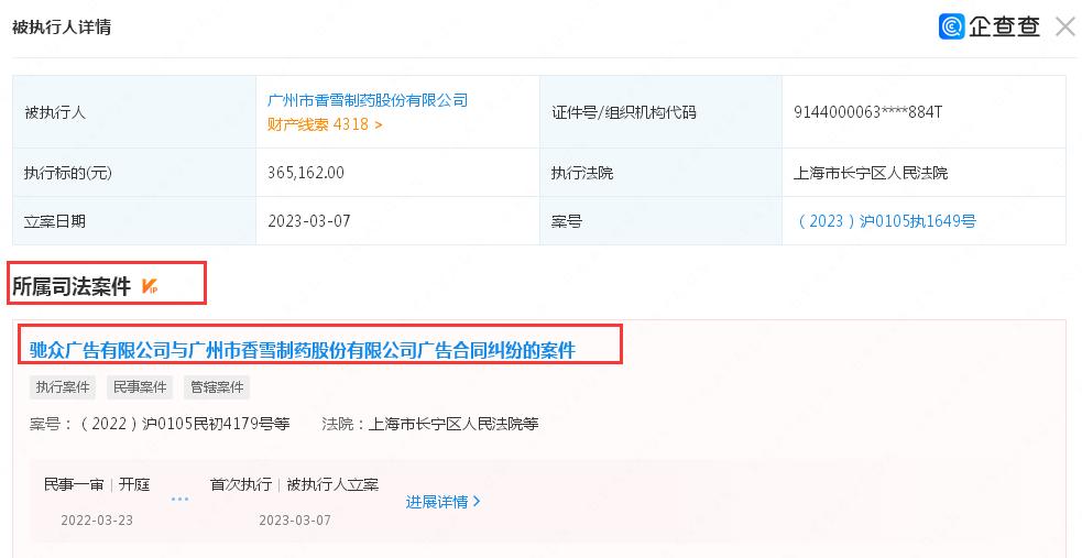 企查查顯示,上述被執(zhí)行信息,所屬司法案件涉及《馳眾廣告有限公司與廣州市香雪制藥股份有限公司廣告合同糾紛的案件》。