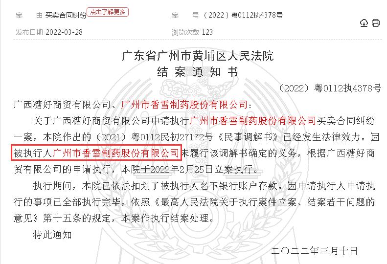 其中,《廣東省廣州市黃埔區(qū)人民法院結(jié)案通知書(2022)粵0112執(zhí)4378號(hào)》顯示,關(guān)于廣西糖好商貿(mào)有限公司申請(qǐng)執(zhí)行廣州市香雪制藥股份有限公司買賣合同糾紛一案,廣東省廣州市黃埔區(qū)人民法院作出的(2021)粵0112民初27172號(hào)《民事調(diào)解書》已經(jīng)發(fā)生法律效力。因被執(zhí)行人廣州市香雪制藥股份有限公司未履行該調(diào)解書確定的義務(wù),根據(jù)廣西糖好商貿(mào)有限公司的申請(qǐng)執(zhí)行,本院于2022年2月25日立案執(zhí)行。