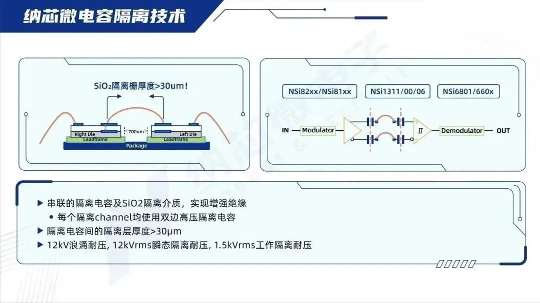 在電容隔離芯片中,隔離電容分別位于兩個(gè)分離的裸片上。由于采用性能優(yōu)越的增強(qiáng)隔離工藝技術(shù)進(jìn)行電氣隔離,兩個(gè)電容極板串聯(lián)在一起,以增強(qiáng)型架構(gòu)實(shí)現(xiàn)隔離。其中間的隔離介質(zhì)是二氧化硅,是一種隔離強(qiáng)度更高的隔離介質(zhì),每微米隔離耐壓能力可達(dá)400V以上,是光耦所使用的隔離介質(zhì)環(huán)氧樹脂的5-6倍。理論上,30微米的隔離柵厚度就可以達(dá)到10kV以上的隔離耐壓。實(shí)際測(cè)試的60秒耐壓也可以達(dá)到12kV水平。另外,電容隔離每通道的差分傳輸架構(gòu)也有助于提高共模噪聲抑制能力。