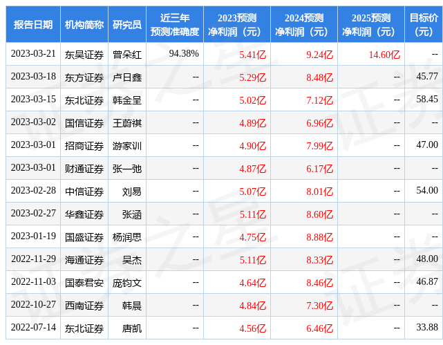 數(shù)據(jù)中心根據(jù)近三年發(fā)布的研報(bào)數(shù)據(jù)計(jì)算,東吳證券曾朵紅研究員團(tuán)隊(duì)對(duì)該股研究較為深入,近三年預(yù)測(cè)準(zhǔn)確度均值高達(dá)94.38%,其預(yù)測(cè)2023年度歸屬凈利潤(rùn)為盈利5.41億,根據(jù)現(xiàn)價(jià)換算的預(yù)測(cè)PE為28.8。