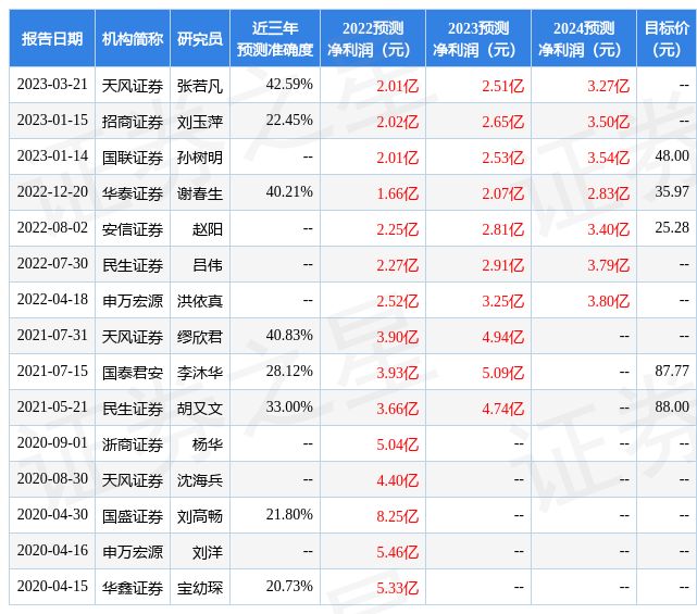 數(shù)據(jù)中心根據(jù)近三年發(fā)布的研報數(shù)據(jù)計算,天風證券(601162)張若凡研究員團隊對該股研究較為深入,近三年預測準確度均值為42.59%,其預測2022年度歸屬凈利潤為盈利2.01億,根據(jù)現(xiàn)價換算的預測PE為53.4。