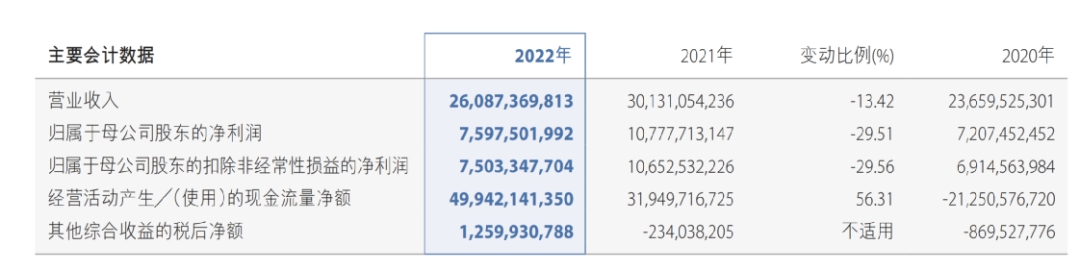 年報顯示,公司主營收入260.87億元,歸母凈利潤75.98億元,扣非凈利潤75.03億元。