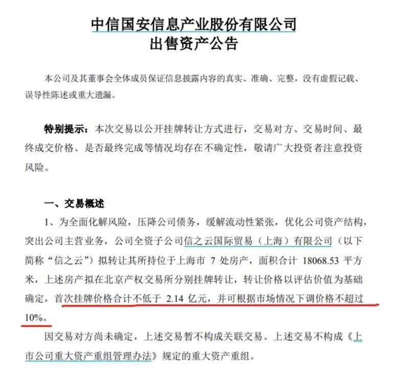 根據(jù)ST國(guó)安4月3日發(fā)布的公告,為全面化解風(fēng)險(xiǎn),壓降公司債務(wù),緩解流動(dòng)性緊張,優(yōu)化公司資產(chǎn)結(jié)構(gòu),突出公司主營(yíng)業(yè)務(wù),公司全資子公司信之云國(guó)際貿(mào)易(上海)有限公司(以下簡(jiǎn)稱(chēng)“信之云”)擬轉(zhuǎn)讓其所持位于上海市7處房產(chǎn),面積合計(jì)18068.53平方米,上述房產(chǎn)擬在北京產(chǎn)權(quán)交易所分別掛牌轉(zhuǎn)讓?zhuān)D(zhuǎn)讓價(jià)格以評(píng)估價(jià)值為基礎(chǔ)確定,首次掛牌價(jià)格合計(jì)不低于2.14億元,并可根據(jù)市場(chǎng)情況下調(diào)價(jià)格不超過(guò)10%。