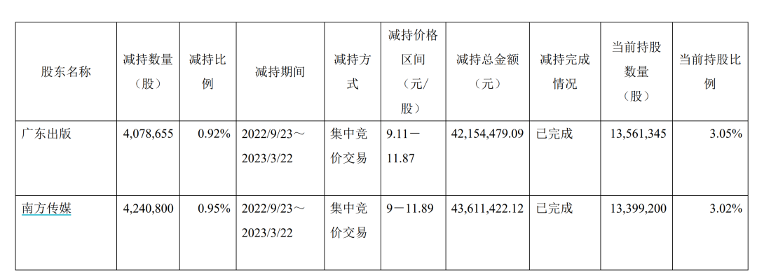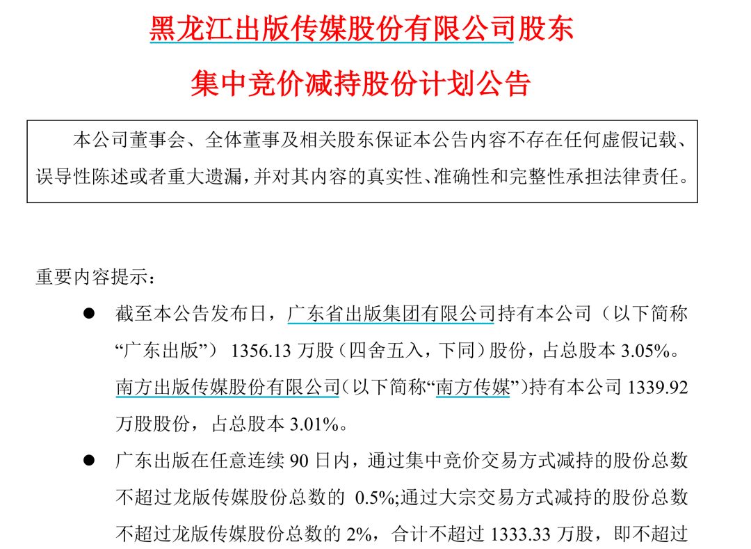 無獨有偶,4月6日,第三大股東廣東省出版集團(tuán)和第四大股東南方傳媒(601900)紛紛表示,兩家合計減持不超過1778萬股龍版?zhèn)髅健?/p>