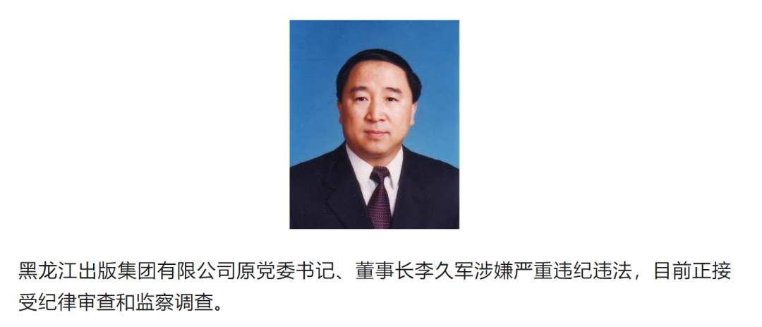 剛剛,據(jù)黑龍江省紀(jì)委監(jiān)委消息,黑龍江出版集團(tuán)有限公司原黨委書記、董事長李久軍涉嫌嚴(yán)重違紀(jì)違法,目前正接受紀(jì)律審查和監(jiān)察調(diào)查。