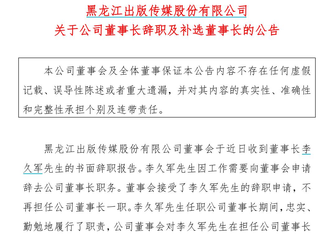 2021年4月6日,龍版?zhèn)髅焦娣Q,公司董事會于近日收到董事長李久軍的書面辭職報告。李久軍因工作需要向董事會申請辭去公司董事長職務(wù)。