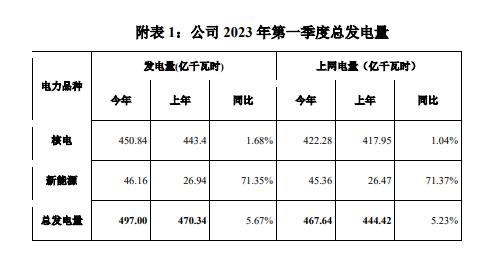4月9日消息,中國核電(601985)發(fā)布一季度發(fā)電量完成情況,公司2023年一季度累計商運發(fā)電量497億千瓦時,同比增長5.67%;上網(wǎng)電量467.64億千瓦時,同比增長5.23%。