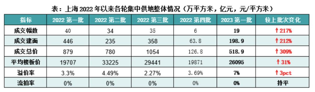 4月21日,上海2023年第一批次集中供地完成全部19宗地塊的出讓,總成交金額519億元,平均成交樓面價26089.9元/㎡,平均溢價率7.3%。其中,4宗地塊底價成交,15宗地進(jìn)入一次性報價,14宗地由央企、國企和地方國資競得。