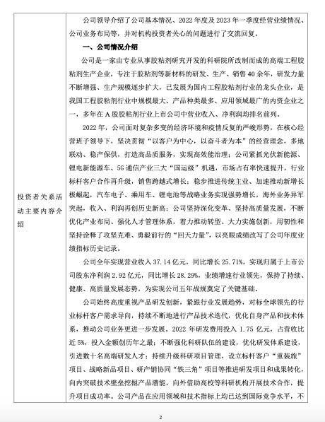 回天新材向投資者介紹了公司基本情況、2022年度及2023年一季度經(jīng)營業(yè)績情況、公司業(yè)務(wù)布局等,并對機(jī)構(gòu)投資者關(guān)心的問題進(jìn)行了交流回復(fù)。