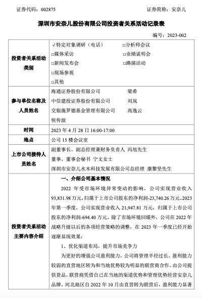 安奈兒向投資者介紹了公司基本情況。2022年受市場環(huán)境異常變動的影響,公司實(shí)現(xiàn)營業(yè)收入93,831.98萬元,歸屬于上市公司股東的凈利潤-23,740.26萬元。2023年第一季度,公司實(shí)現(xiàn)營業(yè)收入21,947.81萬元,歸屬于上市公司股東的凈利潤-694.40萬元。除了市場環(huán)境回暖外,公司在2022年戰(zhàn)略升級以后的各項(xiàng)經(jīng)營策略的調(diào)整,在2023年一季度已經(jīng)開始逐漸顯現(xiàn)效果: