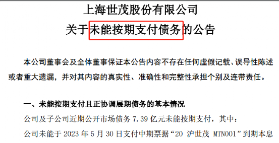6月2日晚公司公告,公司及子公司近期公開市場債務(wù)7.39億元未能按期支付,其中:公司未能于2023年5月30日支付中期票據(jù)“20滬世茂MTN001”到期本息2540萬元、“21滬世茂MTN001”到期利息833萬元、“21滬世茂MTN002”到期利息586萬元;子公司未能于2023年4月10日支付資產(chǎn)支持專項計劃“希爾頓01”的資產(chǎn)支持證券退出款7億元。
