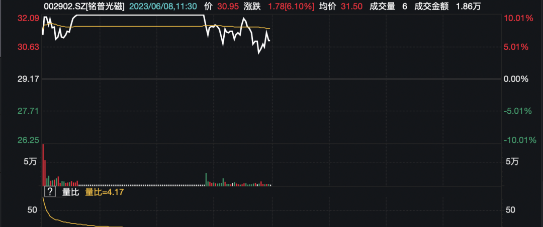 6月8日,銘普光磁早盤再次漲停,不過臨近午間收盤打開漲停板,截至午間收盤,漲6.10%,報30.95元/股。