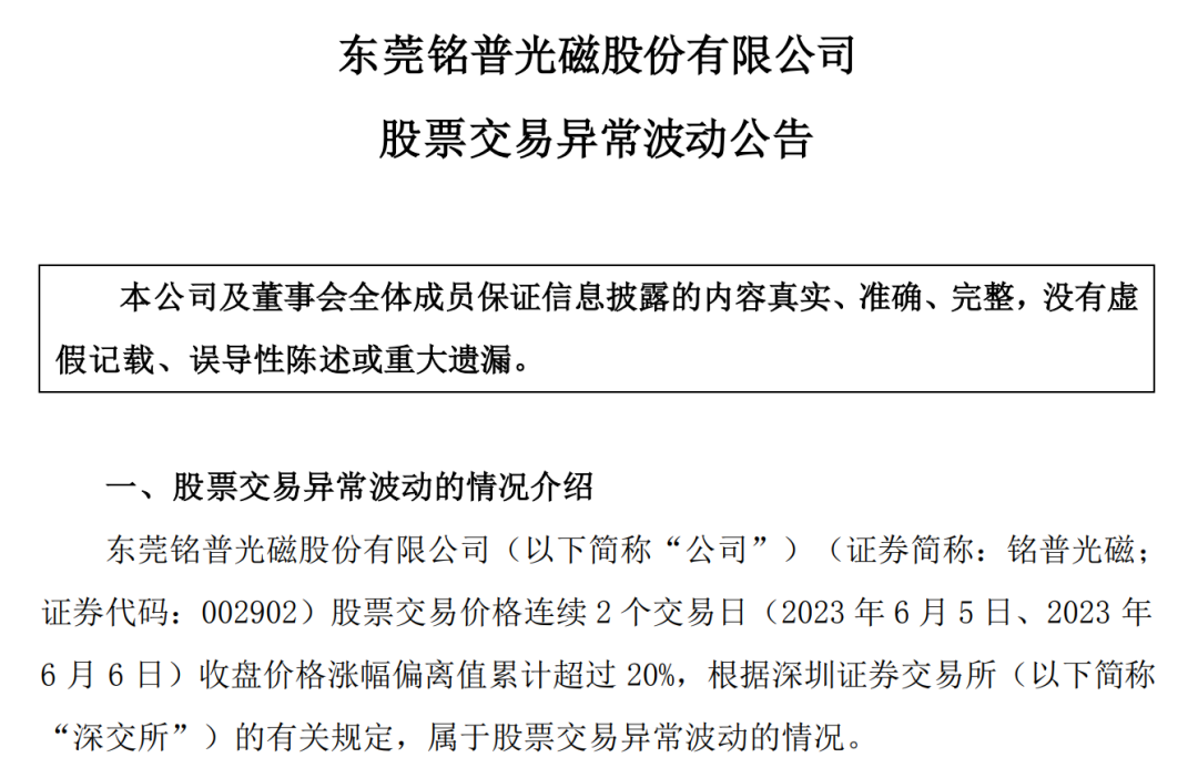 6月6日晚,銘普光磁曾發(fā)布股票交易異常波動公告稱,公司未發(fā)現(xiàn)近期公共傳媒報道了可能或已經(jīng)對公司股票交易價格產(chǎn)生較大影響的未公開重大信息;公司已披露的經(jīng)營情況、內(nèi)外部經(jīng)營環(huán)境未發(fā)生重大變化;公司、控股股東和實(shí)際控制人不存在關(guān)于公司的應(yīng)披露而未披露的重大事項(xiàng)。