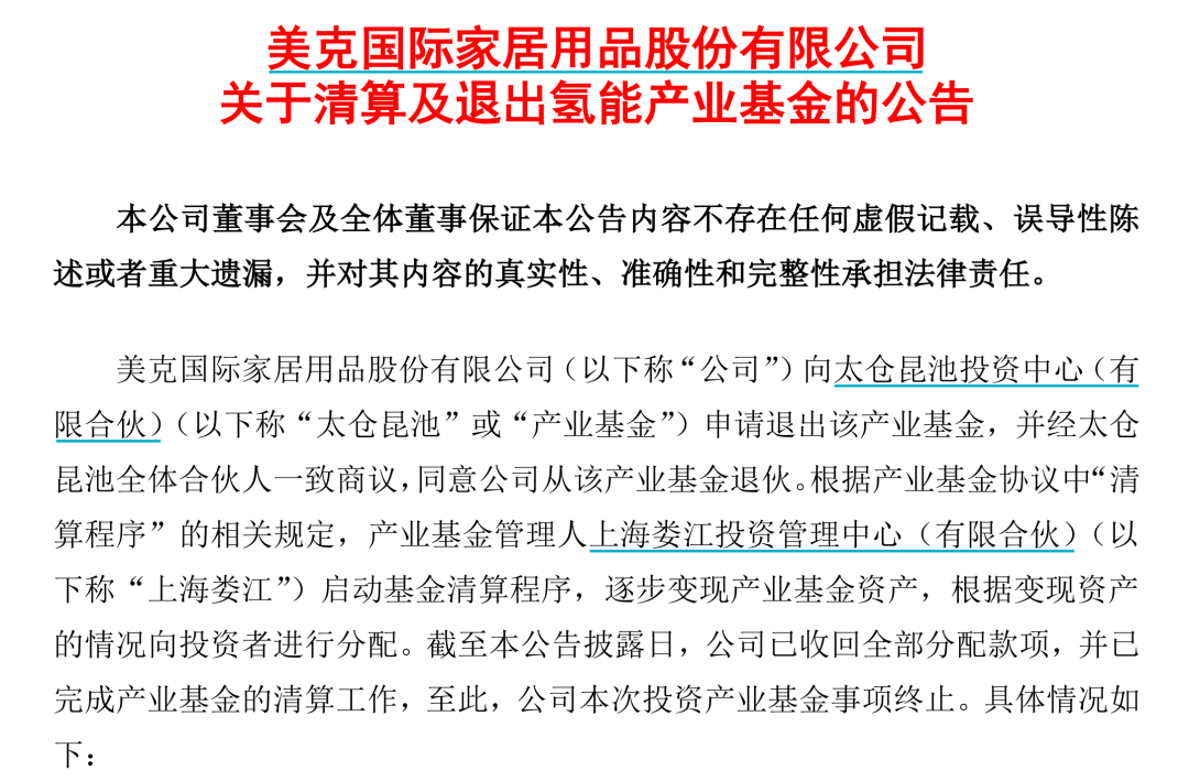 近日,越來越多的上市公司終止參與成立產(chǎn)業(yè)基金。剛剛,頻繁跨界的美克家居(600337)表示,已經(jīng)從2019年成立的氫能產(chǎn)業(yè)基金中完全退出。