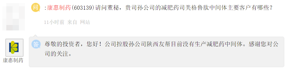 其實(shí),在當(dāng)天的交易時(shí)間內(nèi),投資者互動(dòng)平臺(tái)上就有多位投資者都在追問康惠制藥司美格魯肽中間體的更多細(xì)節(jié)問題。對此,康惠制藥改口表示,陜西友幫目前沒有生產(chǎn)減肥藥中間體。