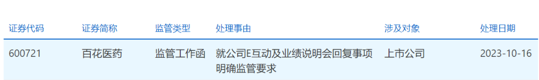 同日晚,上交所也向百花醫(yī)藥下發(fā)監(jiān)管工作函,處理事由為:就公司E互動(dòng)及業(yè)績說明會(huì)回復(fù)事項(xiàng)明確監(jiān)管要求。