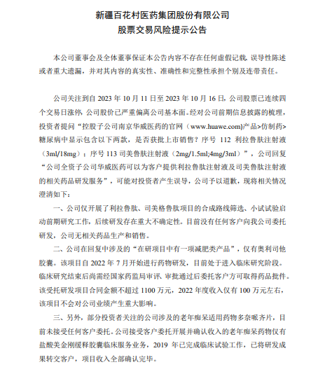 此外,10月11日至10月16日,百花醫(yī)藥(600721)已連續(xù)四個(gè)交易日漲停。16日晚,百花醫(yī)藥發(fā)布股票交易風(fēng)險(xiǎn)提示公告,稱公司在回復(fù)投資者的提問時(shí)表示,“公司全資子公司華威醫(yī)藥可以為客戶提供利拉魯肽注射液及司美魯肽注射液的相關(guān)藥品研發(fā)服務(wù)”,可能對投資者產(chǎn)生誤導(dǎo),公司予以道歉。