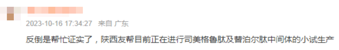 在股吧中,有投資者表示,這證實(shí)了陜西友幫目前正在進(jìn)行司美格魯肽及替泊爾肽中間體的小試生產(chǎn)。