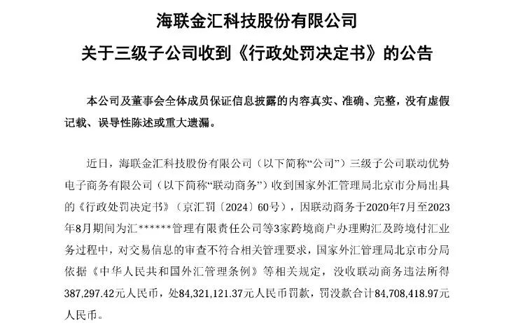 9月13日晚間,海聯(lián)金匯(002537)公告,公司三級子公司聯(lián)動優(yōu)勢電子商務(wù)有限公司(以下簡稱“聯(lián)動商務(wù)”)被國家外匯管理局北京市罰沒8470.84萬元。