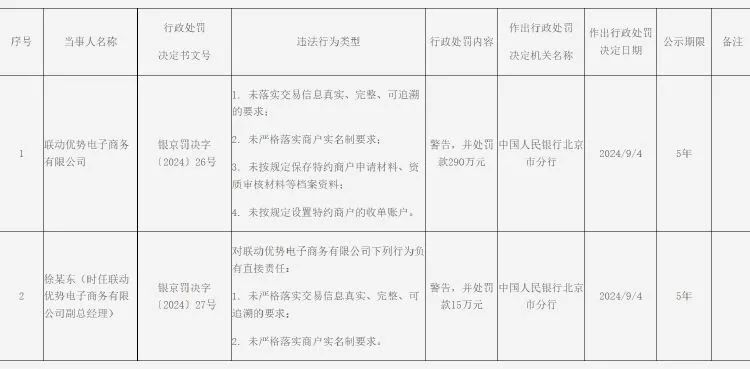 值得注意的是,這已經(jīng)是聯(lián)動商務(wù)本月內(nèi)第二次遭到處罰。中國人民銀行北京市分行網(wǎng)站日前披露的行政處罰信息顯示,聯(lián)動商務(wù)被罰290萬元,時任副總經(jīng)理被罰15萬元,處罰決定日期為9月4日。