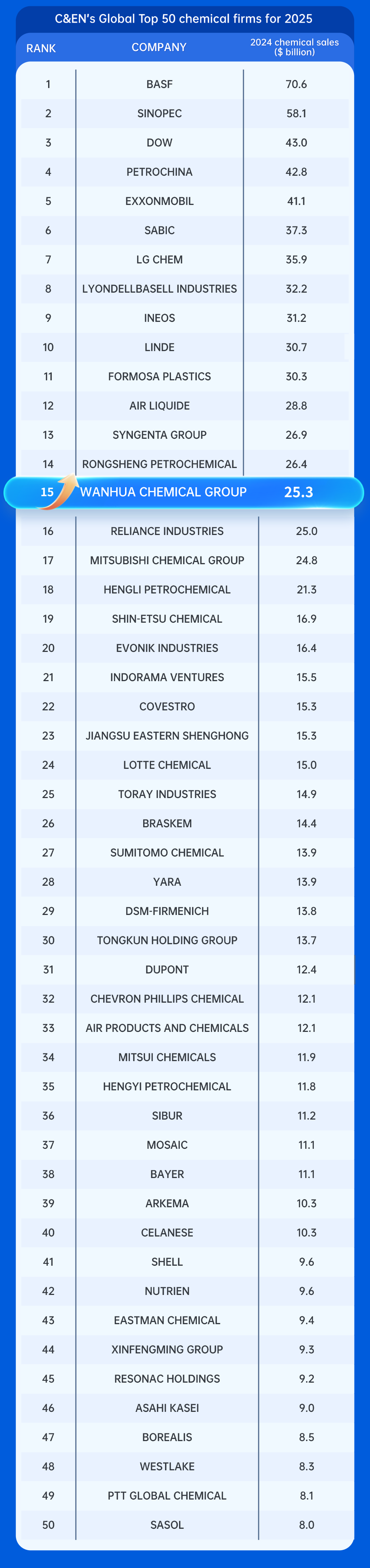萬(wàn)華化學(xué)位列C&EN全球化工企業(yè)50強(qiáng)第15位