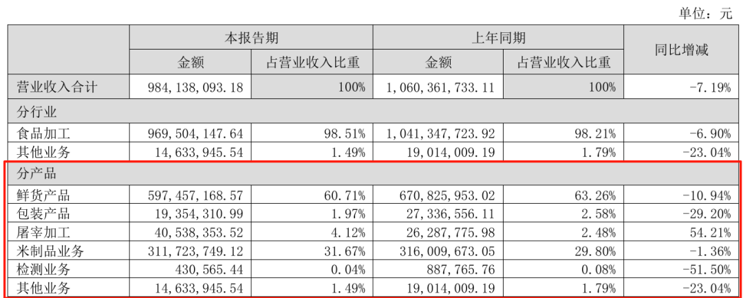 具體來(lái)看,煌上煌的主要產(chǎn)品營(yíng)收近乎全線下滑,鮮貨產(chǎn)品、包裝產(chǎn)品、米制品業(yè)務(wù)分別同比減少10.94%、29.20%、1.36%,僅屠宰加工產(chǎn)品營(yíng)收上升54.21%。