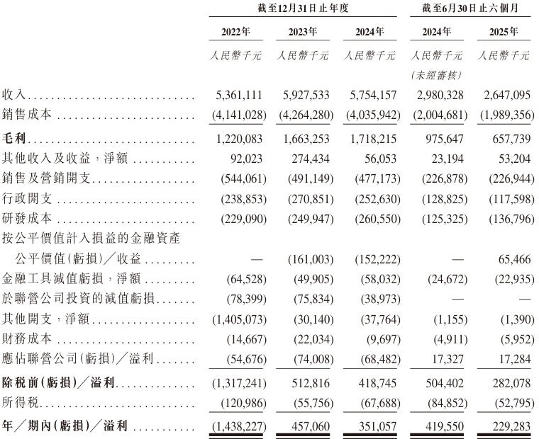 業(yè)績方面,2022年、2023年、2024年及2025年截至6月30日止六個月,該公司實現(xiàn)收入分別約為53.61億元、59.28億元、57.54億元、26.47億元人民幣;同期,年/期內(nèi)溢利約為-14.38億元、4.57億元、3.51億元、2.29億元人民幣。